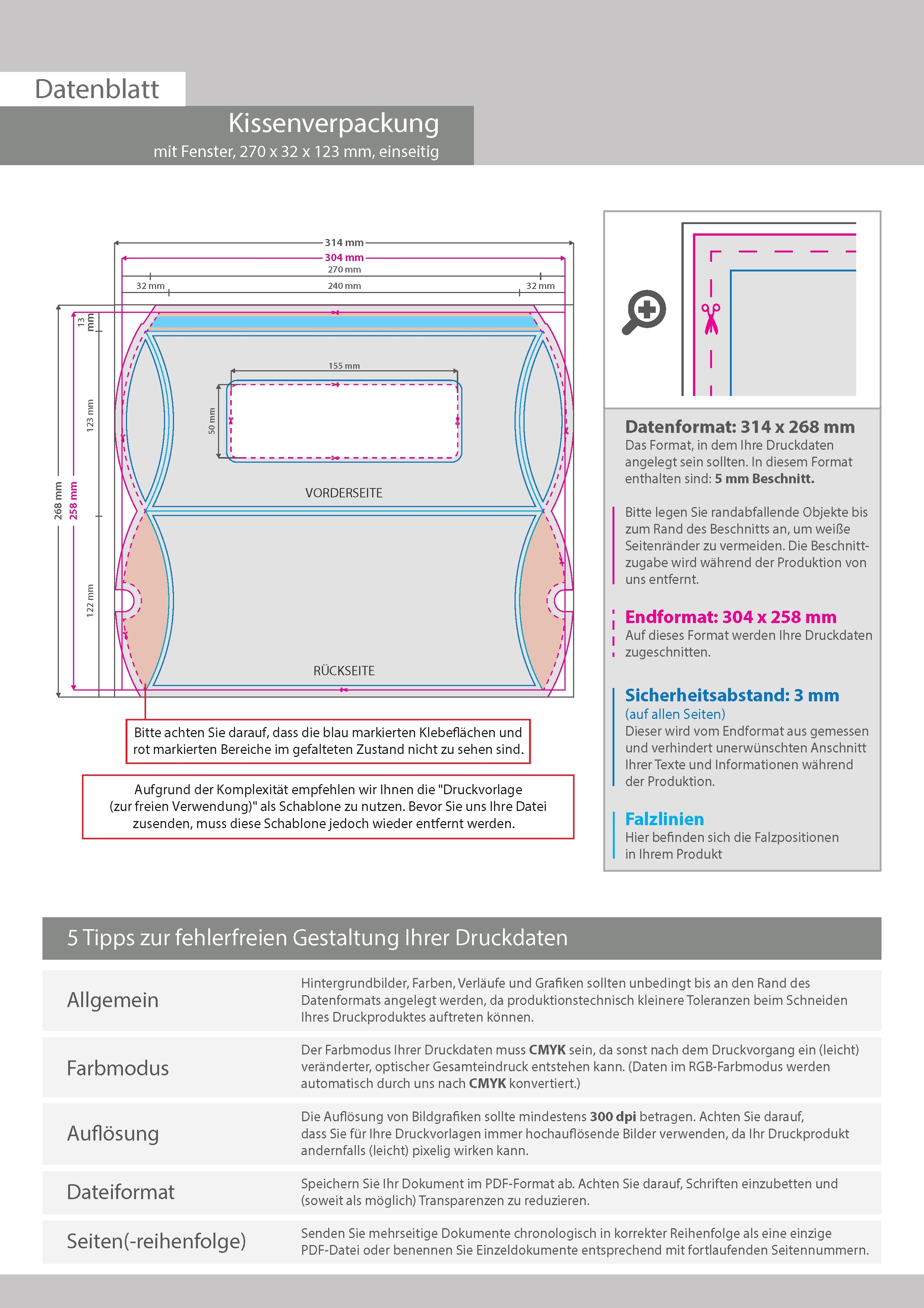 Kissenverpackung (27 cm x 3,2 cm x 12,3 cm) einseitig bedruckt 4/0-farbig mit gestanztem Fenster
