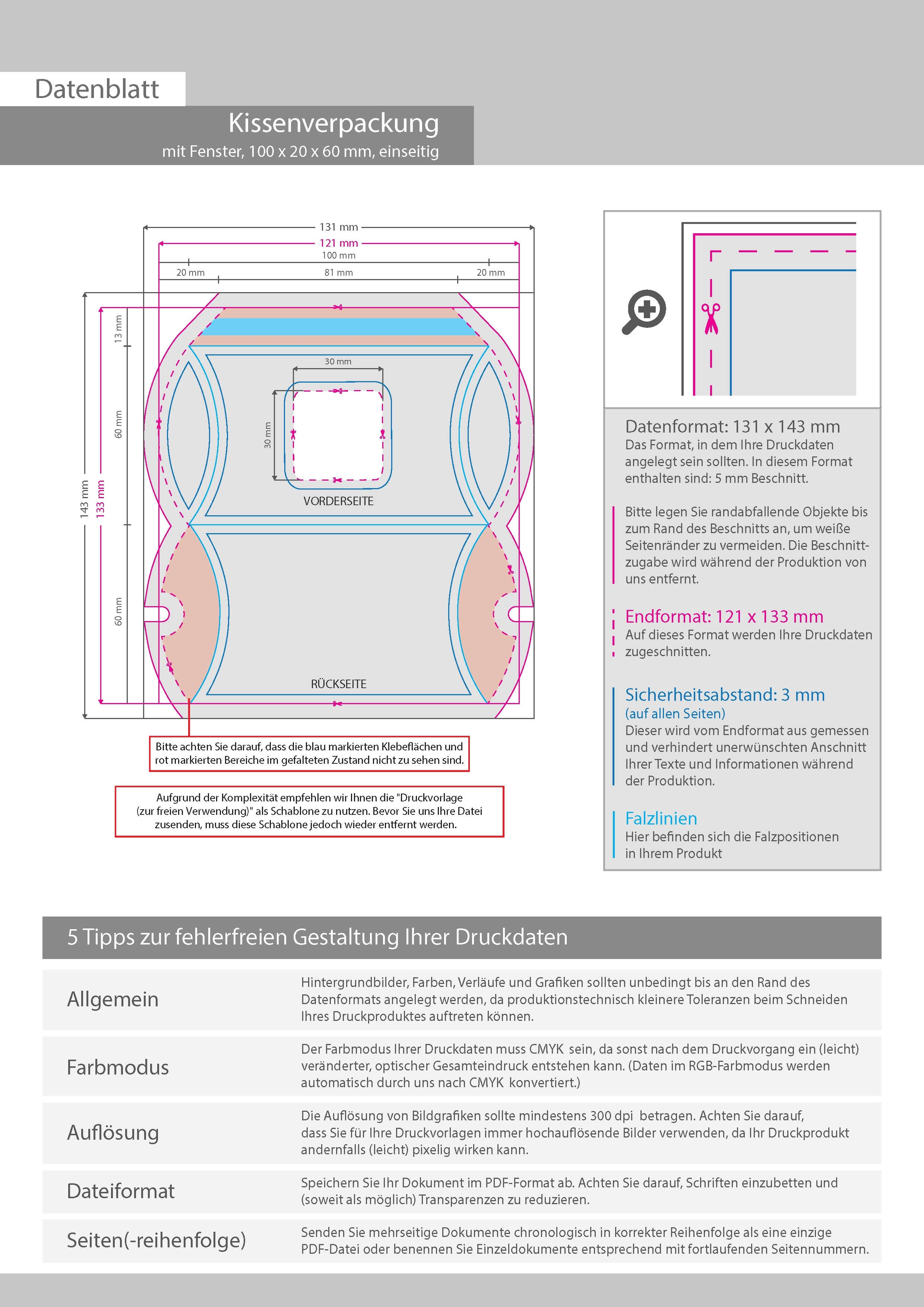 Kissenverpackung (10 cm x 2 cm x 6 cm) einseitig bedruckt 4/0-farbig mit gestanztem Fenster
